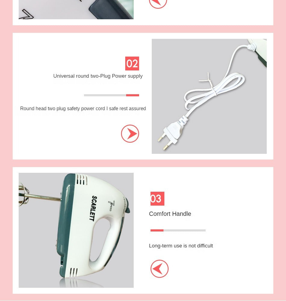 🍰🥚 Mixer electric Scarlett 300W cu 7 viteze – ajutorul ideal pentru prepararea rapidă și ușoară a deserturilor și rețetelor tale preferate. Compact, silențios și eficient, acest mixer nu este doar pentru ouă, ci pentru smântână, frișcă, creme, gemuri și aluaturi ușoare.