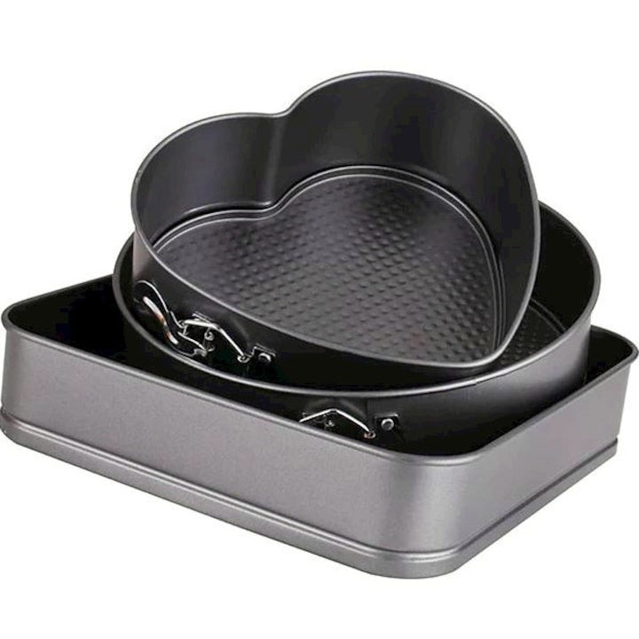 Coace prăjituri perfecte pentru orice ocazie cu Setul de 3 tăvi de copt cu fund detașabil 🍰✨. Ai la îndemână cele mai iubite 3 forme – rotundă, inimă și pătrată – ca să pregătești rapid torturi, cheesecake, tarte sau deserturi creative, fără bătaie de cap la scoaterea din tavă.