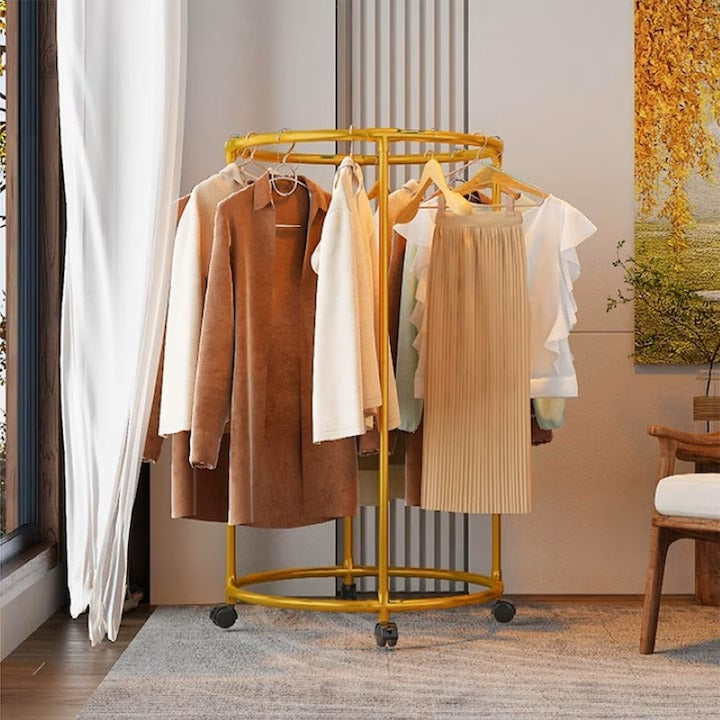 Organizează-ți hainele rapid și eficient cu suportul rotund metalic cu roți, ideal pentru dressing, dormitor, hol sau spații comerciale. Bara circulară de 130 cm oferă spațiu generos pentru umerașe, iar designul rotund îți permite să vezi și să accesezi fiecare articol din orice unghi. Se montează ușor, fără unelte, și aduce un plus de ordine și stil modern în orice încăpere.
