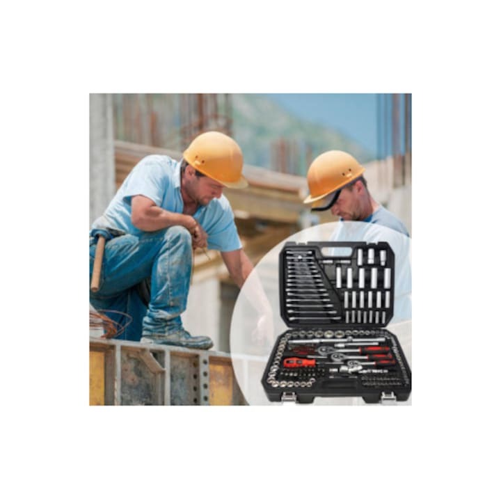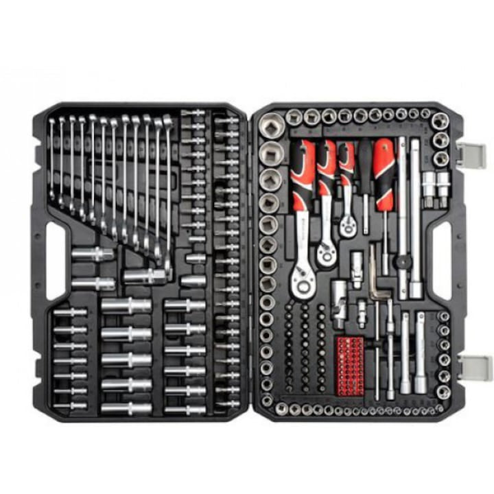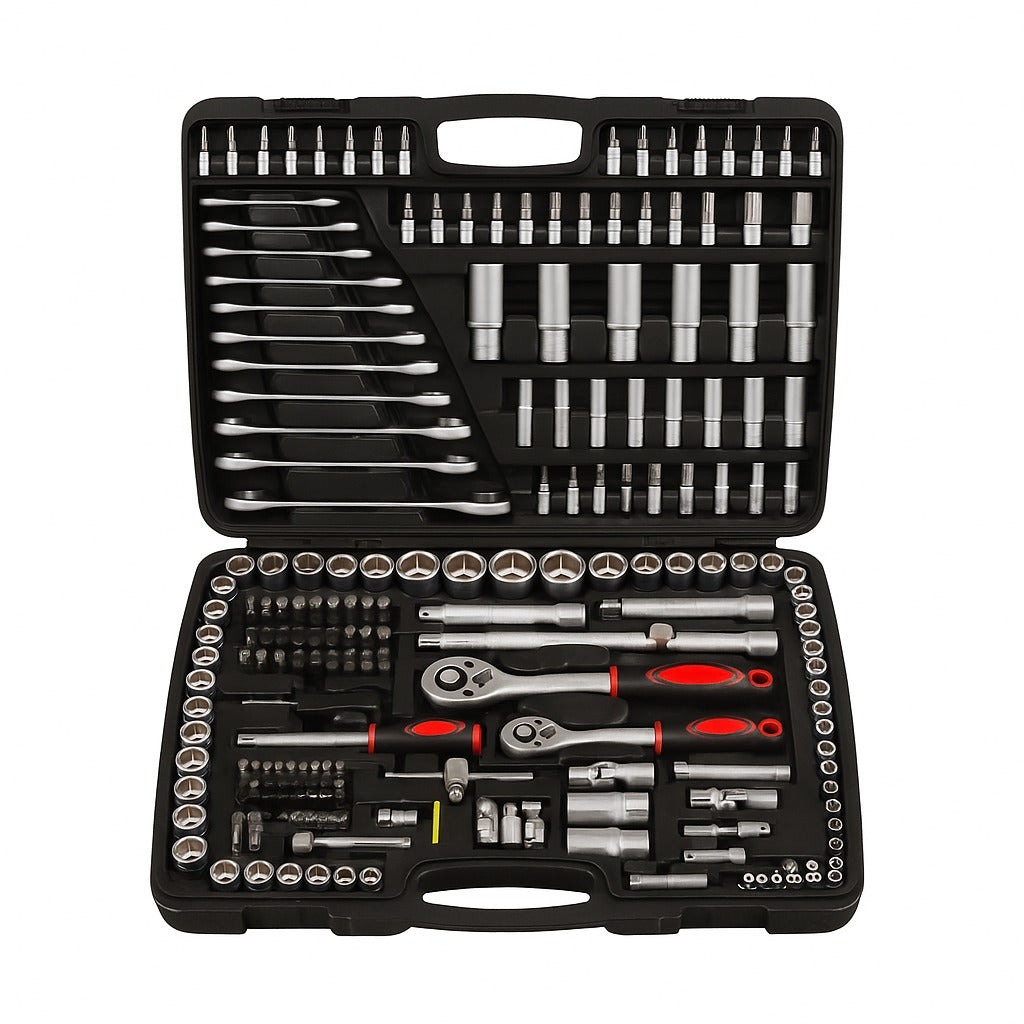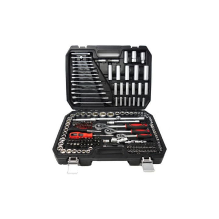 Trusa profesională de 216 piese este alegerea ideală pentru mecanici, service-uri auto, ateliere și pasionații de reparații. Conține o gamă completă de chei tubulare, chei fixe, biți, clichete și accesorii, toate fabricate din oțel crom-vanadiu Cr-V 50BV30, recunoscut pentru durabilitate excepțională, rezistență la uzură și coroziune.